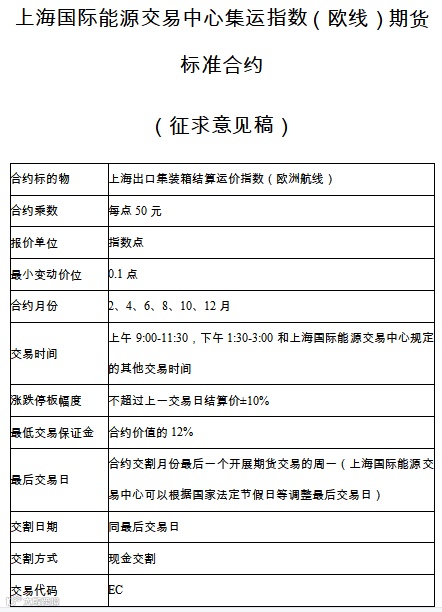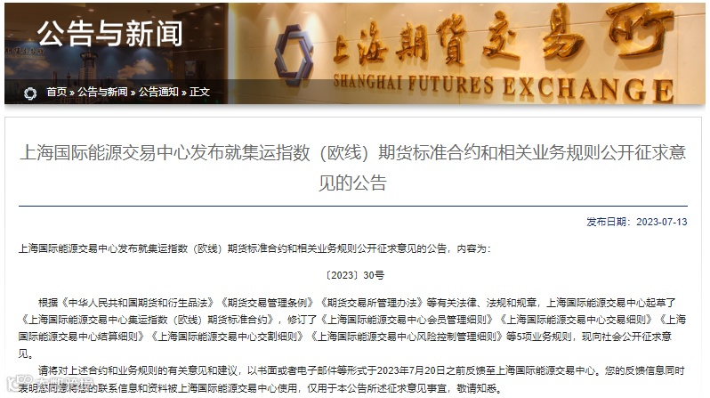 2023年7月13日,上海期货交易所(下称上期所)子公司上海国际能源交易中心(下称上期能源)发布公告,就上海出口集装箱结算运价指数(欧洲航线)期货【下称集运指数(欧线)期货】合约和相关业务细则公开征求意见。