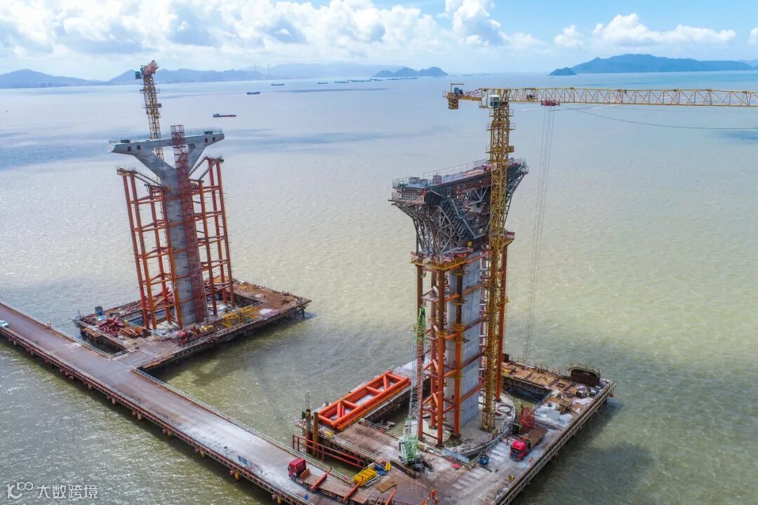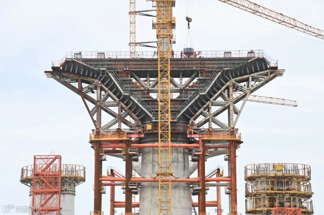 黄茅海大桥整幅式TY型墩分东西两侧,其西过渡墩、辅助墩由保利长大承建。盖梁最大高度为60米,长度达到37.4米,分三次浇筑完成,大悬臂盖梁设计在桥梁建造领域较为少见,也是项目中施工难度最大的分项工程。