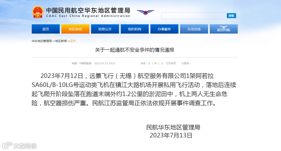 据中国民用航空华东地区管理局网站消息,2023年7月12日,远景飞行(无锡)航空服务有限公司1架阿若拉SA60L/B-10LG号运动类飞机在镇江大路机场开展私用飞行活动,落地后连续起飞爬升阶段坠落在跑道末端外约1.2公里的淤泥田中,机上两人无生命危险,航空器损伤严重。民航江苏监管局正依法依规开展事件调查工作。
