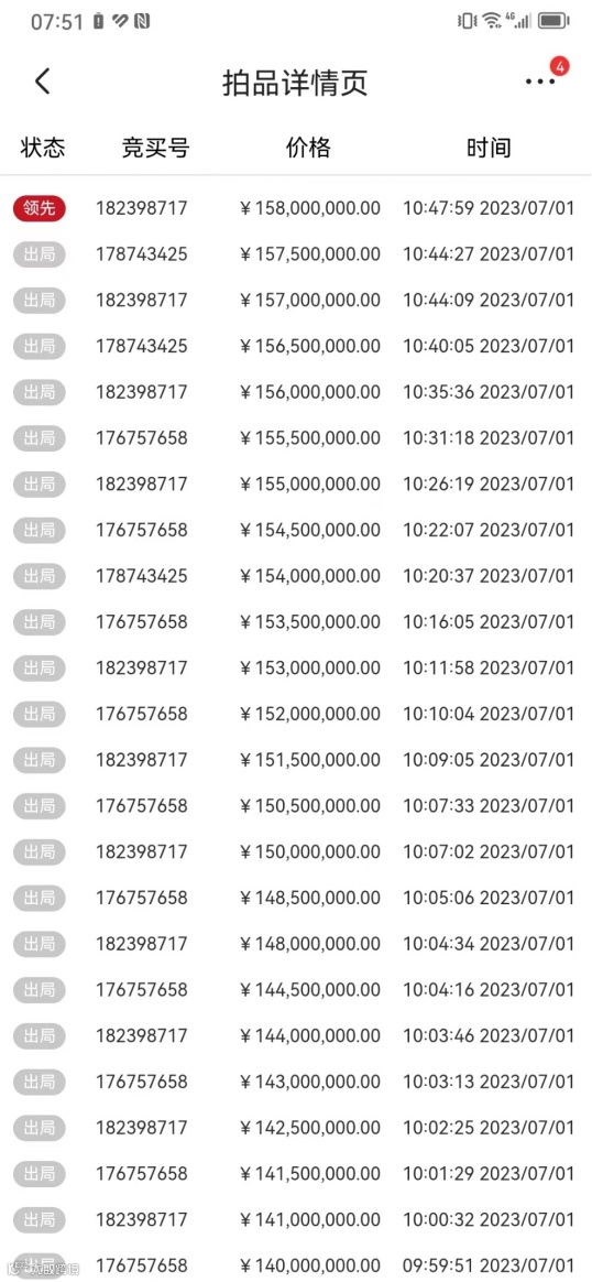 根据拍品页面信息,该套住宅共吸引了16003人围观,最终3人报价。出价从6月30日开始,起拍价1.25亿元,经过39轮的激烈报价,于7月1日10:52结束竞拍,代码为“182398717”的竞拍人将该套住宅收入麾下。