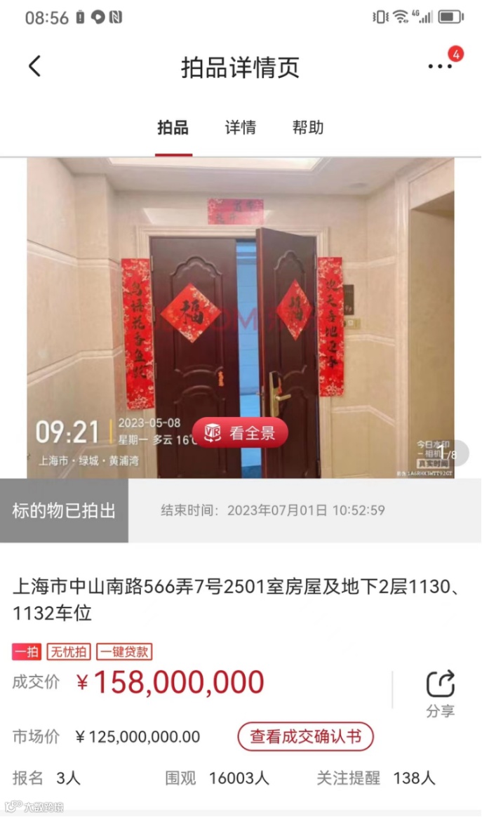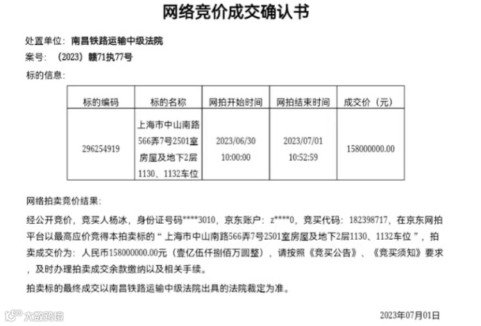 7月1日,京东房产拍卖页面显示,“上海市中山南路566弄7号2501室房屋及地下2层1130、1132车位”以1.58亿元的价格成交,较起拍价1.25亿元溢价26.4%。