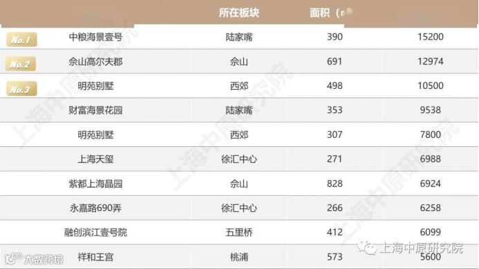 来自中原地产的数据显示,5月上海二手豪宅成交总价最高的房源位于陆家嘴中粮海景壹号,网签总价1.52亿元,单价超过38万元/平方米,排名第二和第三的分别是佘山高尔夫郡和西郊明苑别墅的两套房子,总价也都超过了1亿元。
