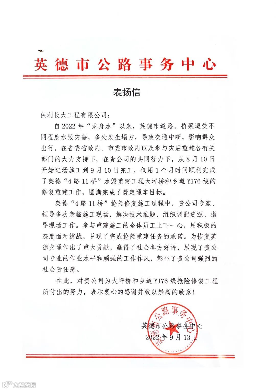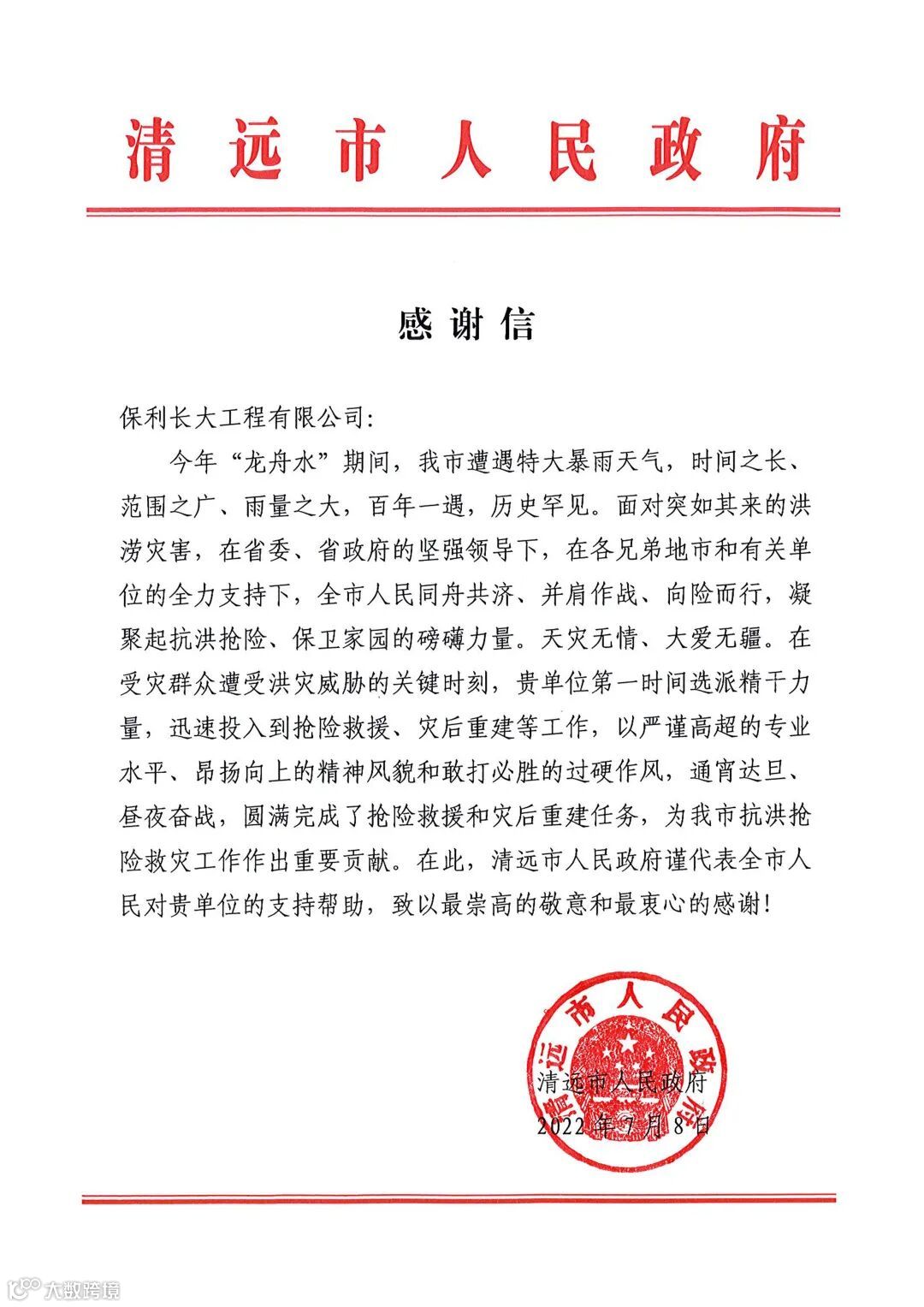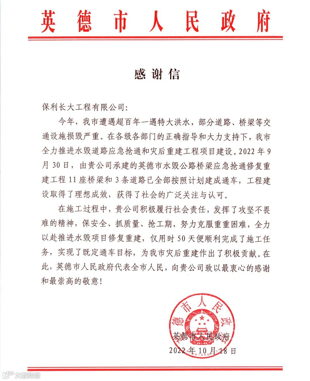 保利长大收到英德市政府发来的感谢信