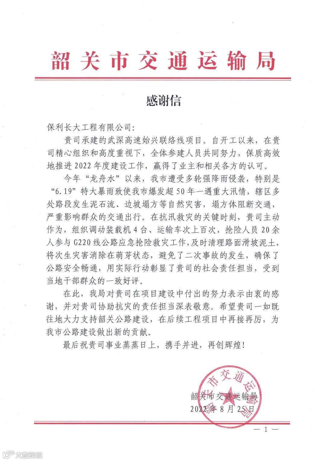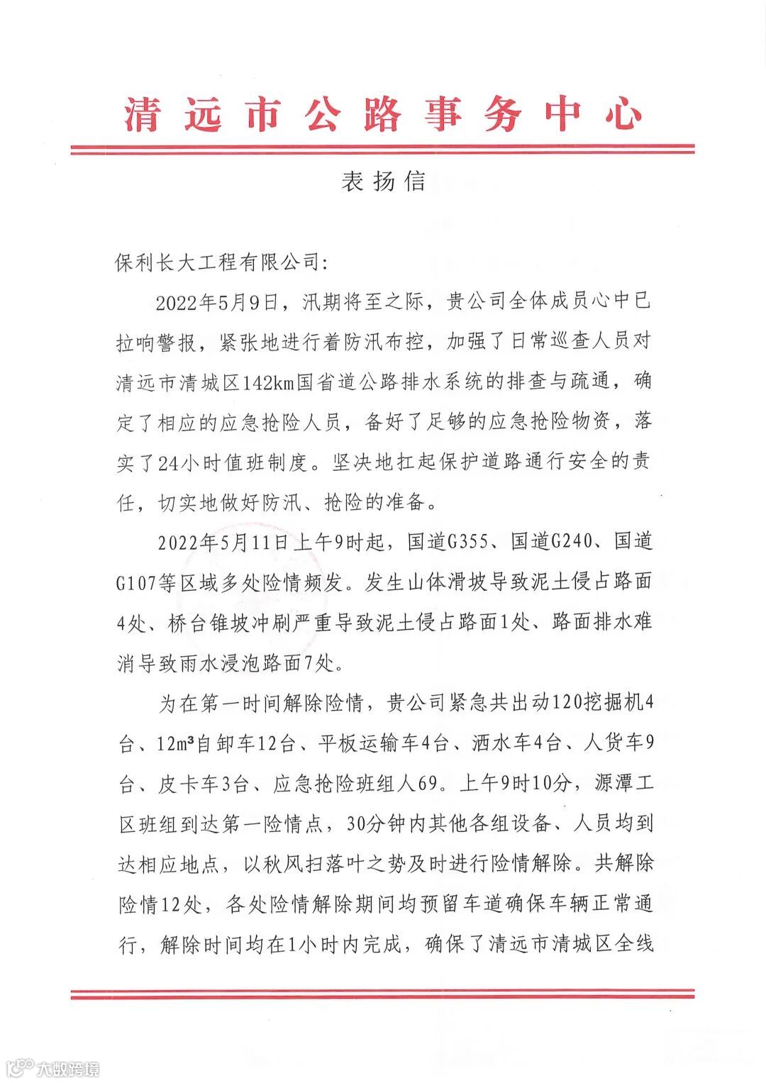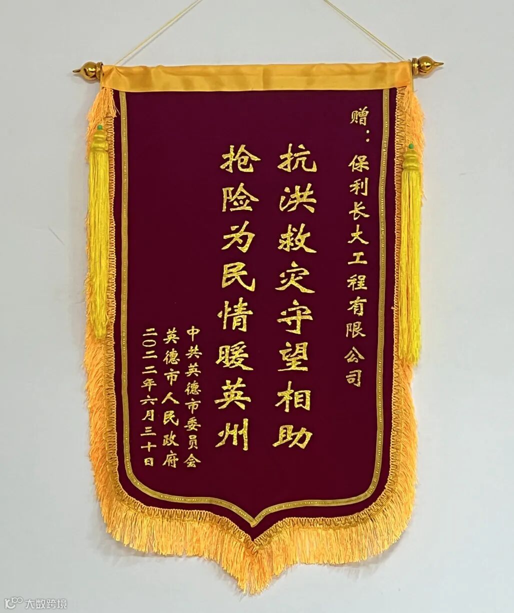 保利长大收到英德市政府发来的感谢信