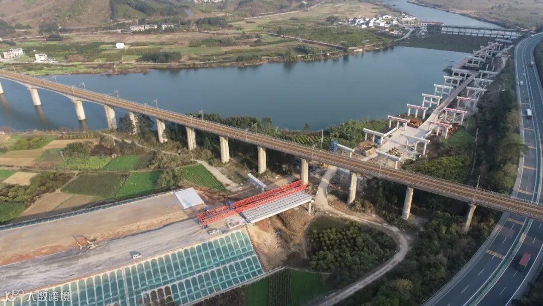 其中,标段控制性工程龙溪高架特大桥左幅长1200米、共计30跨,右幅长520米、共计13跨。由于大桥1-3跨下穿衡柳高铁洛清江特大桥第26到28号墩,距衡柳高铁桥墩最近仅2.52米,施工协调组织、梁板架设难度巨大。