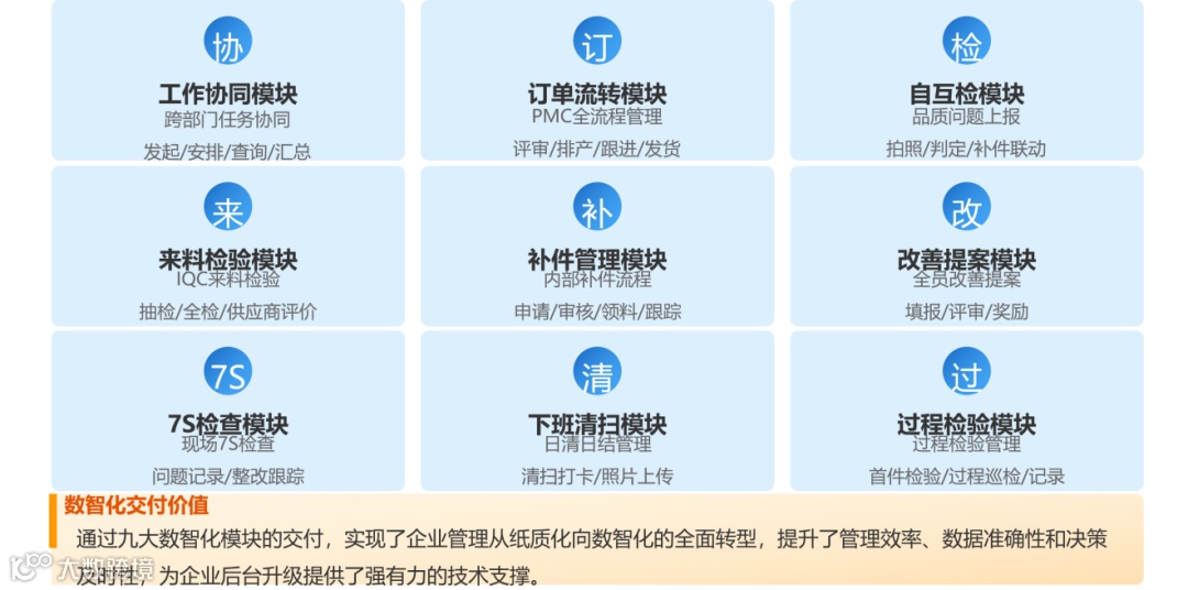 项目累计完成涵盖工作协同、来料检验、7S管理、订单流转、自互检、过程巡检、补件管理、改善提案、下班清扫在内的九大数智化模块建设,落地具体工作达48项。通过“流程规范+数智工具”的双轮驱动,成功将管理要求固化于系统,实现了管理过程的透明化、标准化与可追溯。