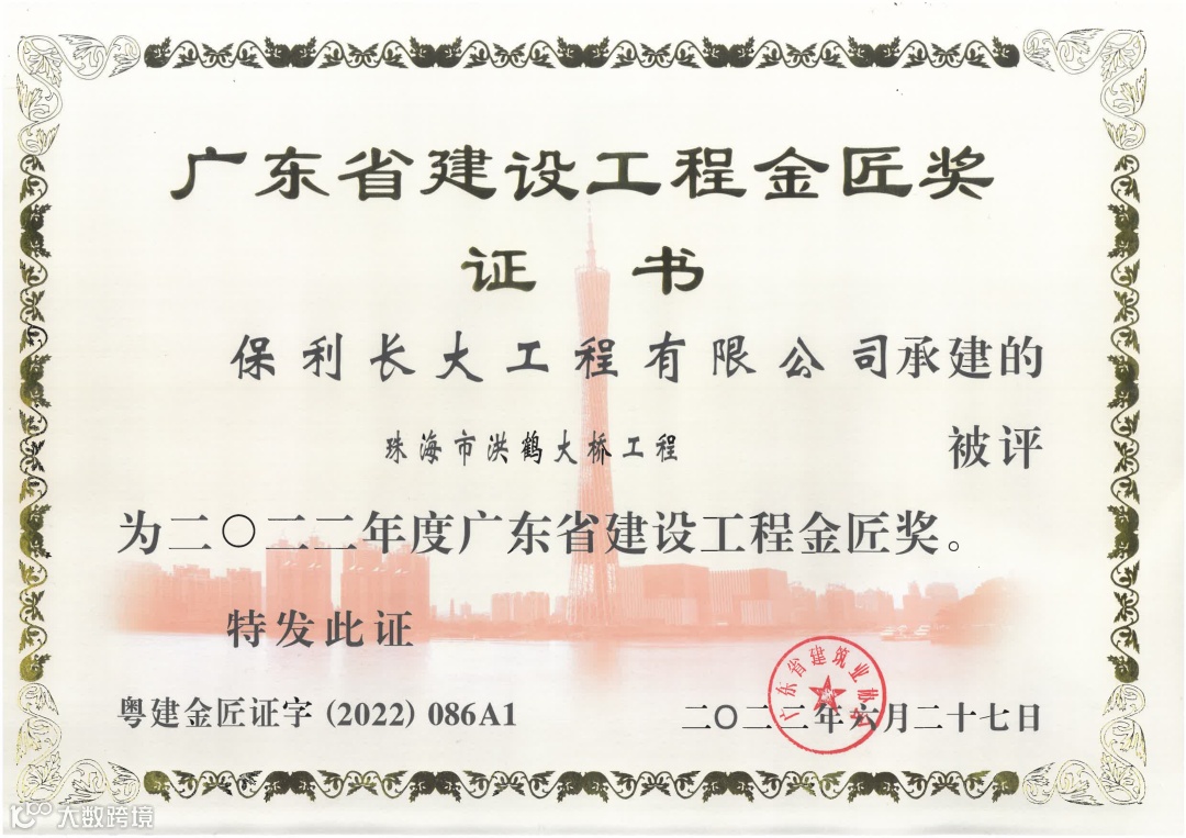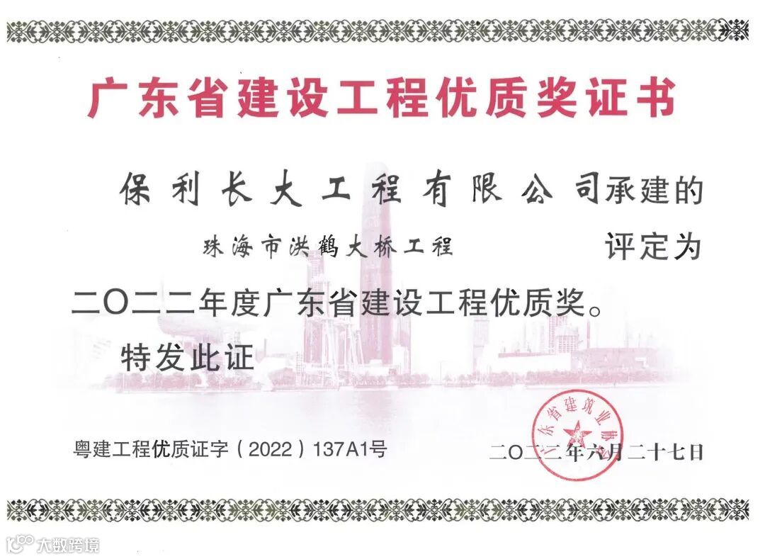 近日,广东省建筑业协会发文公布2022年度广东省建设工程表彰名单,保利长大参建的珠海市洪鹤大桥工程榜上有名,同时获得“金匠奖”“优质奖”双料荣誉。