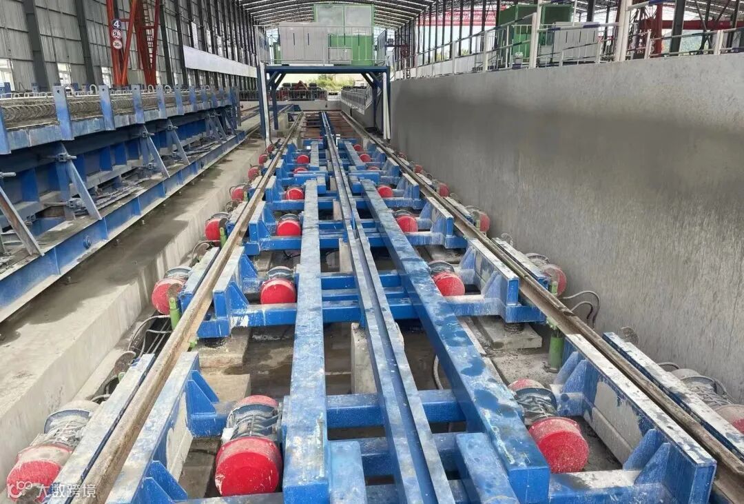 该技术攻克了传统造桥技术梁场占地面积需求大、预制构件生产管理难度大等问题,降低人工及机械设备投入的同时,大幅提高生产效率,单片双T梁的生产时间由传统7天提升到37个小时就可完成,实现了“机械化减人、自动化替人”的目的,有效促进大型预制构件集中化生产、流水化作业。