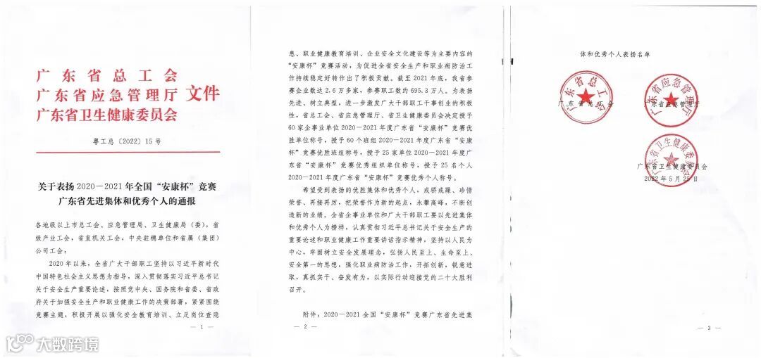 近日,广东省总工会、广东省应急管理厅、广东省卫生健康委员会联合发文,表彰2020-2021年度全国“安康杯”竞赛广东省先进集体和优秀个人。