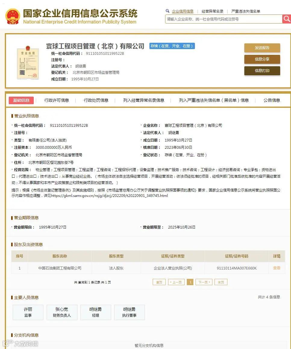 据中国新闻网,中新财经查询国家企业信用信息公示系统网站发现,信息显示,如媒体所述,胡继勇为寰球工程项目管理(北京)有限公司法定代表人、执行董事、经理。