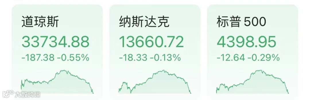 美东时间周五,美股三大指数集体收跌。截至收盘,道指跌0.55%,纳指跌0.13%,标普500指数跌0.29%。