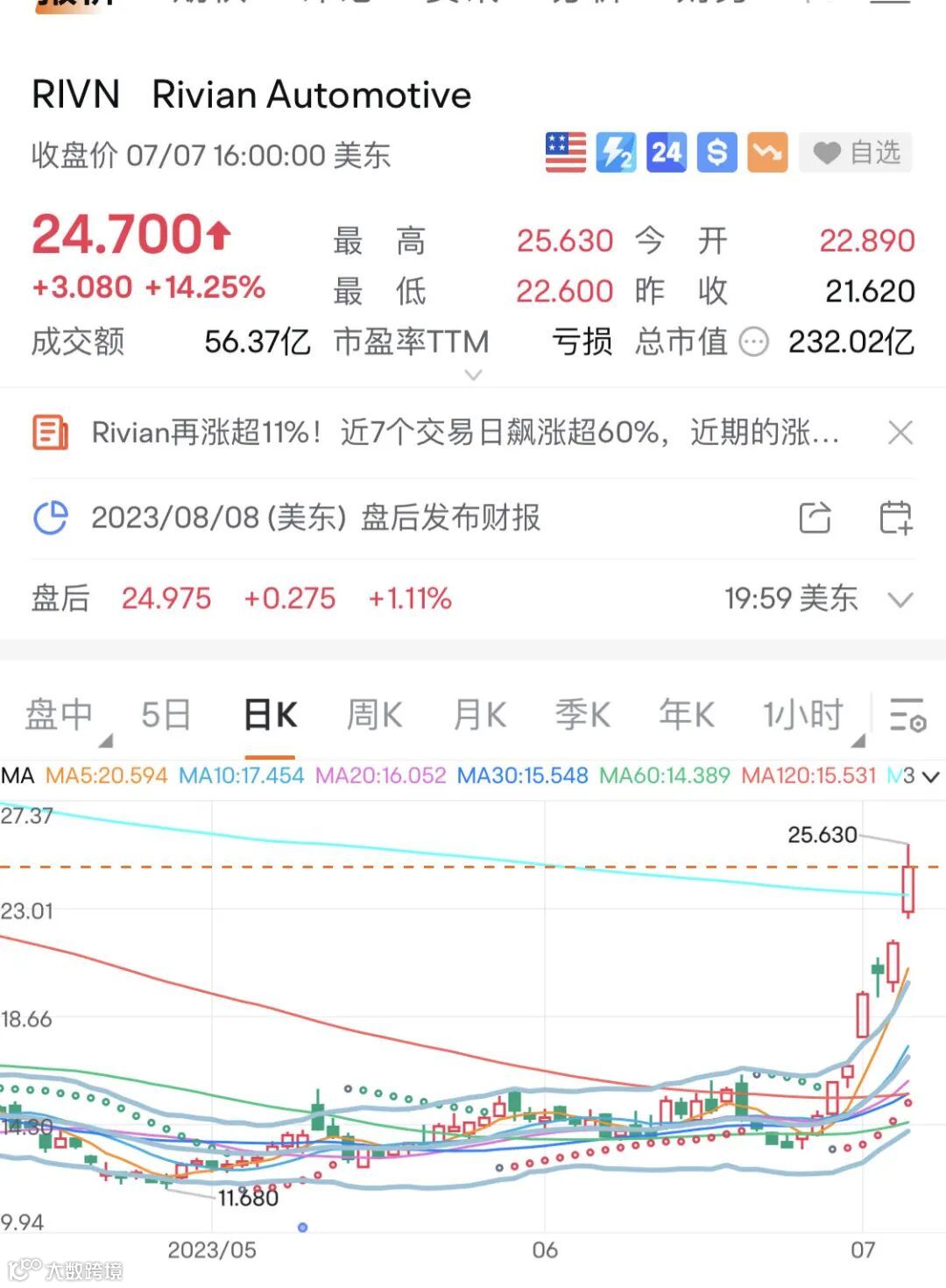 值得注意的是,Rivian近段时间涨势凶猛,近7个交易日累计涨幅已超60%。公司市值超过1600亿人民币。
