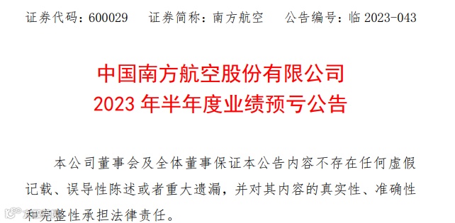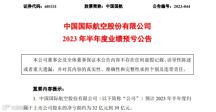 中国国航预计上半年净利润亏损约32亿元到39亿元,上年同期亏损194.35亿元;中国东航预计上半年亏损55亿元至69亿元,上年同期净亏损187.36亿元。