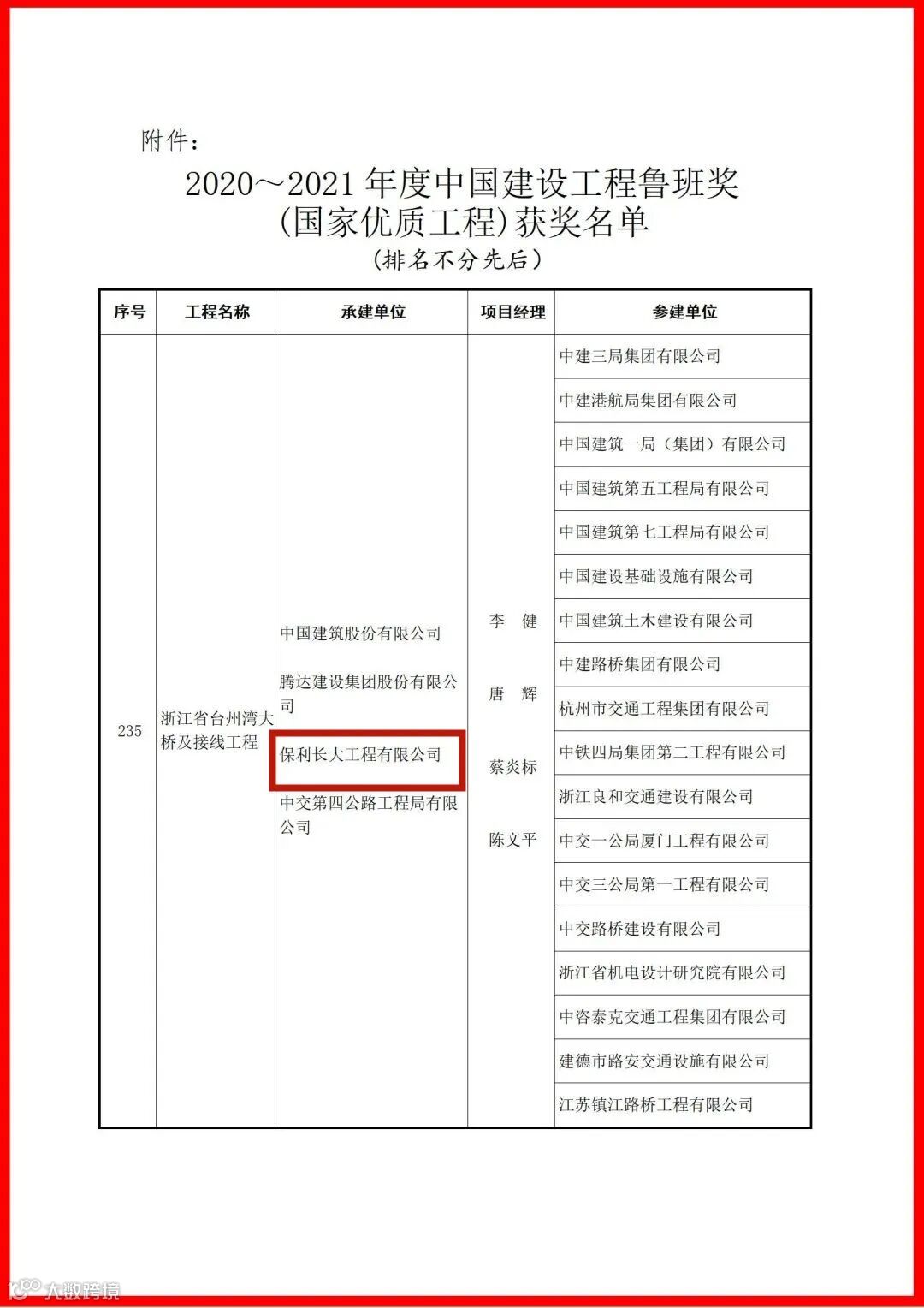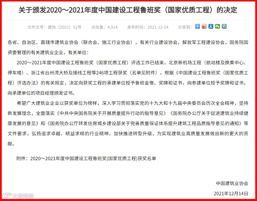 12月14日,中国建筑行业协会正式发布2020~2021年度中国建设工程鲁班奖(国家优质工程)获奖名单,保利长大工程有限公司承建的浙江台州湾大桥及接线工程位列其中。继摘得2020~2021年度“李春奖”后,项目取得的又一重大荣誉。