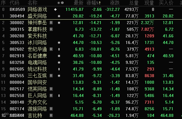 网络游戏跌幅最大,盛天网络盘中跌停,收盘跌幅19.24%,神州泰岳、掌趣科技、冰川网络分别下跌14.21%、13.72%、10.53%,世纪华通、电魂网络、姚记科技等跌停。