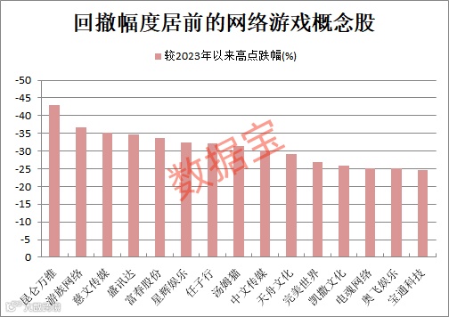 近期随着AI类题材的回落,概念股随之大幅调整。最新收盘价与年内高点相比,超半数概念股回撤幅度20%以上。昆仑万维、游族网络、慈文传媒回撤幅度排在前三位。
