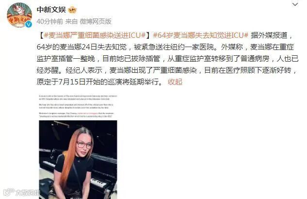 外媒:麦当娜严重细菌感染送进ICU,目前已逐渐好转。