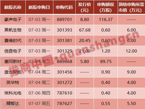 本周(7月3日~7月7日)共有9只新股发行。具体来看,周一4只:豪声电子、昊帆生物、赛维时代、信音电子;周二3只:惠同新材、盘古智能、英华特;周四1只:埃科光电;周五1只:精智达。
