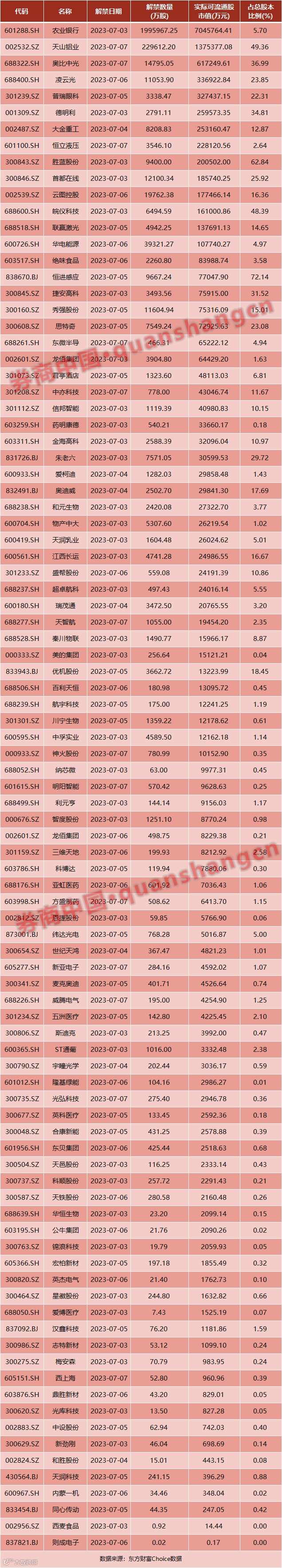 数据显示,本周(7月3日~7月7日)共有93家公司限售股陆续解禁,合计解禁量246.11亿股,按6月30日收盘价计算,解禁市值为1267.5亿元。