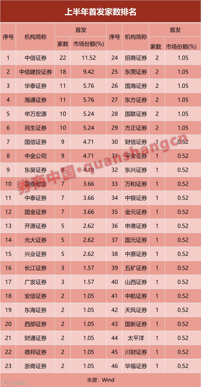在IPO承销家数方面,中信证券、中信建投分别以22家、18家的数量领跑,华泰证券、海通证券、民生证券、申万宏源等6家券商上半年IPO数量也在10家或以上。