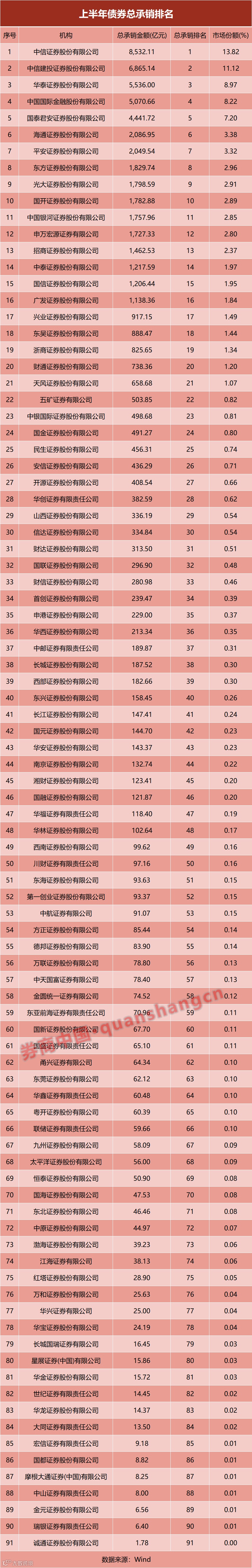 今年上半年,91家券商完成债券承销规模6.17万亿元,同比增长12.18%;总承销债券数量达到1.67万只,同比增长8.4%。