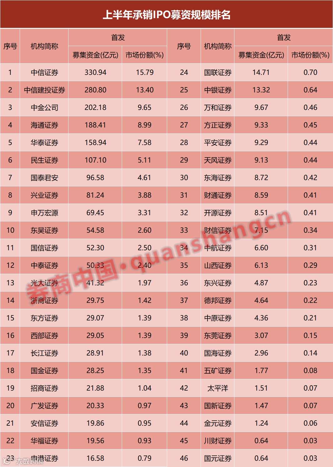 从IPO承销金额来看,今年上半年,中信证券、中信建投分别以330.94亿元、280.80亿元排名第一、第二,中金公司、海通证券、华泰证券紧随其后。