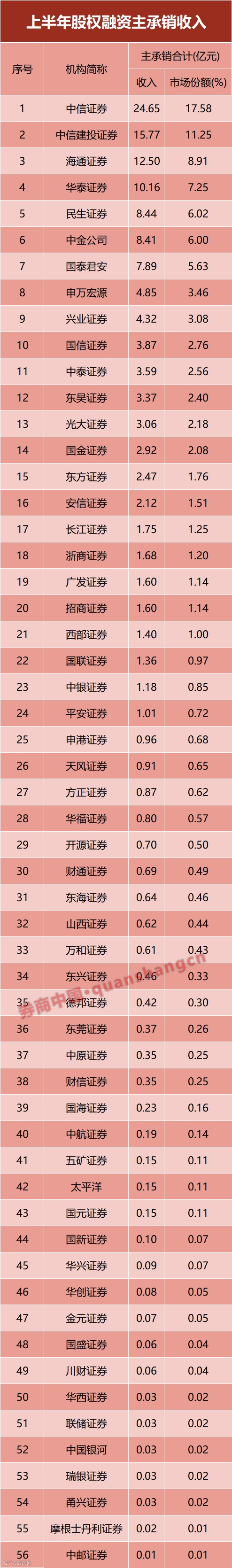 今年上半年,股权主承销收入超10亿元的券商有4家,超3亿元的有13家。中信证券一家遥遥领先,揽入收入24.65亿元,比第二名的中信建投多出9亿元。