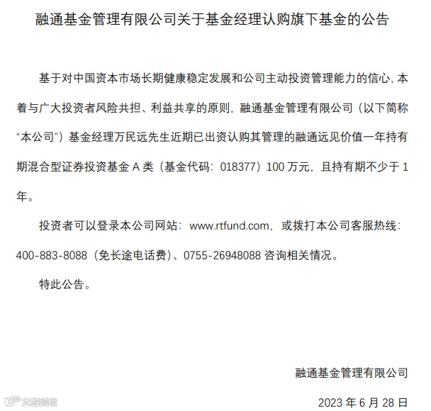 根据6月28日融通基金公告,基于对中国资本市场长期健康稳定发展和公司主动投资管理能力的信心,本着与广大投资者风险共担、利益共享的原则,基金经理万民远近期已出资100万元认购他管理的融通远见价值一年持有混合基金A份额(基金代码:018377),且持有期不少于1年。