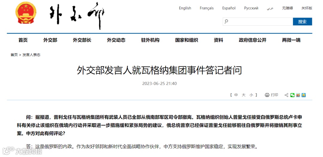 据外交部网站消息,6月25日,外交部发言人就瓦格纳集团事件答记者问。