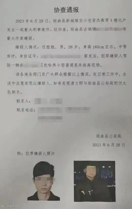 6月28日,一份运城垣曲县公安局发布的协查通报在网络流传。通报称,2023年6月28日,垣曲县新城镇京小宅晋杰商贸4楼北户发生一起重大刑事案件。经侦查,垣曲县古城镇任某某有重大作案嫌疑。