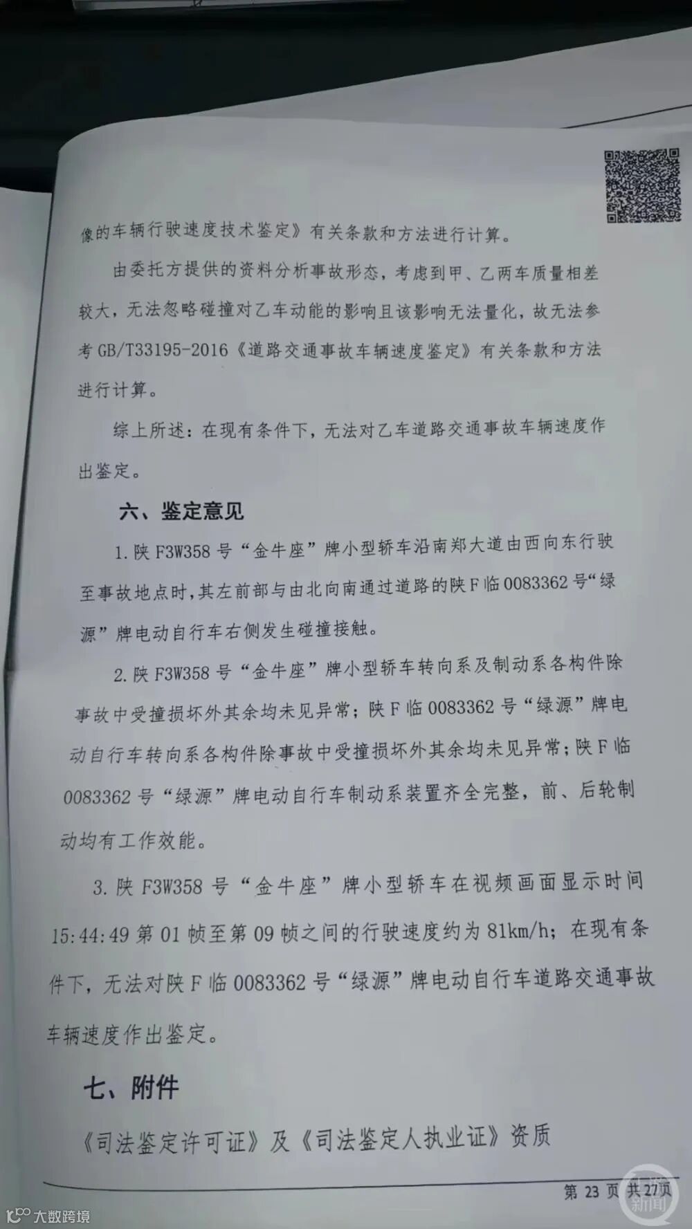 受汉中市公安局南郑分局交通警察大队委托,6月9日,陕西西安金华交通事故痕迹物证司法鉴定所对这起交通事故出具的《司法鉴定意见书》显示,涉事白色小轿车和电动车“受撞损坏外其余均未见异常”。