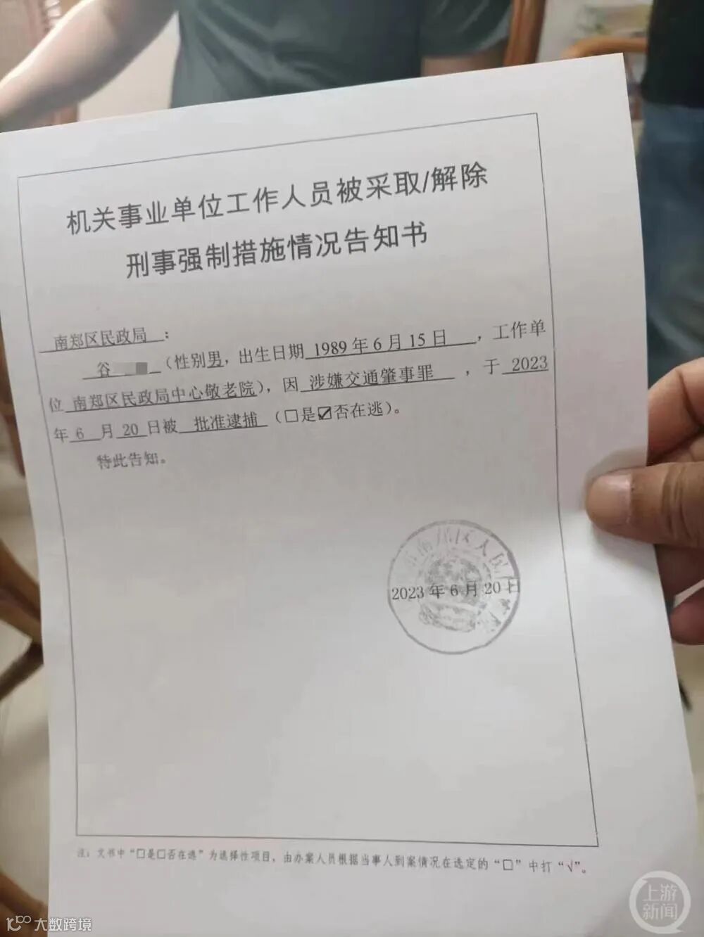 汉中市南郑区民政局有关负责人告诉记者,目前,南郑区民政局已经收到了承办该案的检察院发放的《机关事业单位工作人员被采取刑事强制措施情况告知书》。目前,区纪委监委派驻区民政局纪检组已经依照党纪有关规定,对此事展开调查。“因为他是事业单位的干部,不属于组织部管理,6月21日,我们已经依照相应规定,对他做出了免职决定。”