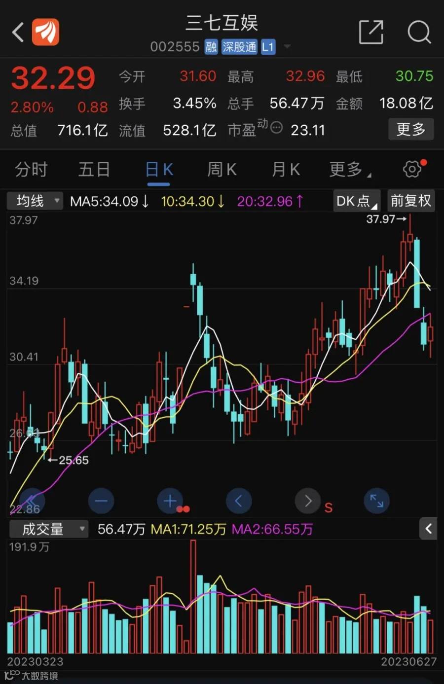 在二级市场上,三七互娱涉及诸多热点概念,如元宇宙、云游戏、华为概念、在线教育等。今年3月份,三七互娱还涉入当时最热门的AIGC概念,3月16日,三七互娱在其官微上发布消息称,3月13日,三七互娱旗下首位虚拟人“葱妹”获赠广州市海珠区首批数字居民证书。三七互娱当时称,“葱妹”的面世,既是三七互娱在元宇宙深耕的体现,也标志着其将在AIGC领域开启全新的尝试。上述消息披露后,3月17日起三七互娱的股价开始加速上涨,持续到6月20日,期间涨幅超过71%。