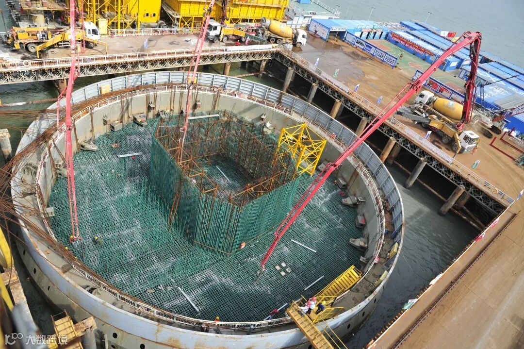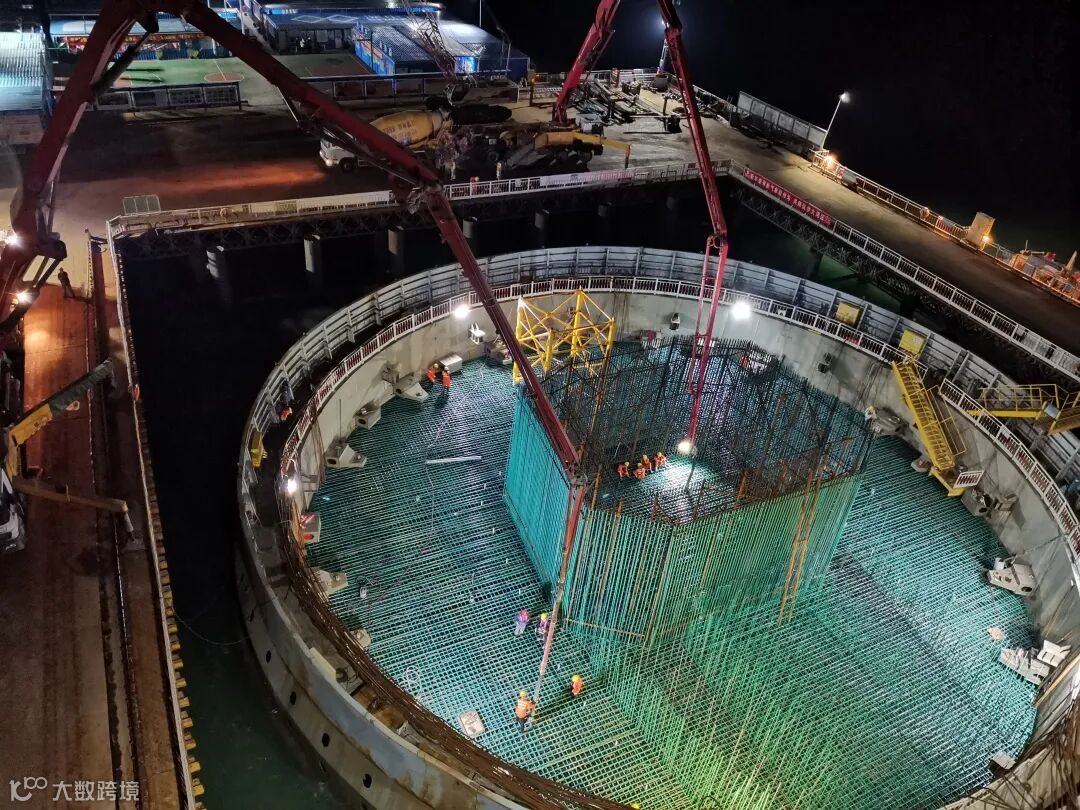 作为伶仃洋大桥基座之一的西索塔承台与陆地相隔35公里,采用分离式承台结构,单个承台平面尺寸高8米,内径36米,为国内最大的海上水中承台,总浇筑量超过8000立方米。项目部于1月1日完成第一层3米高、共3046立方混凝土浇筑,此次完成的第二层浇筑共5米高、混凝土总方量为5098立方米。
