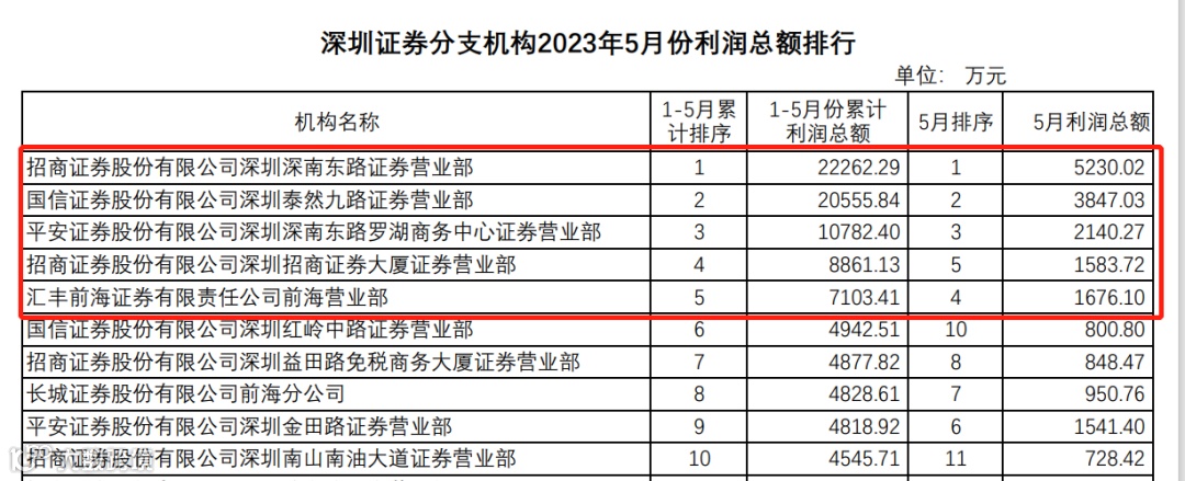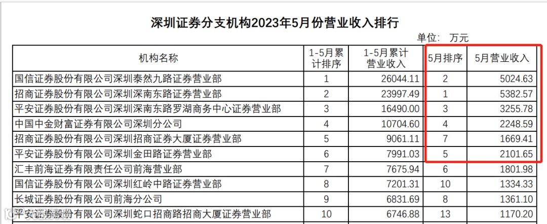除了深圳证券分支机构整体情况,来看看营业部5月具体表现情况。