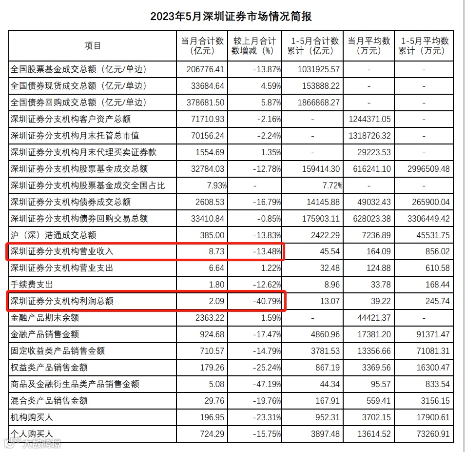 数据显示,今年5月,深圳券商分支机构整体营业收入8.73亿元,环比下降13.48%;利润总额2.09亿元,环比下降40.79%。此外,深圳证券分支机构的多项市场指标也出现不同程度的下滑。