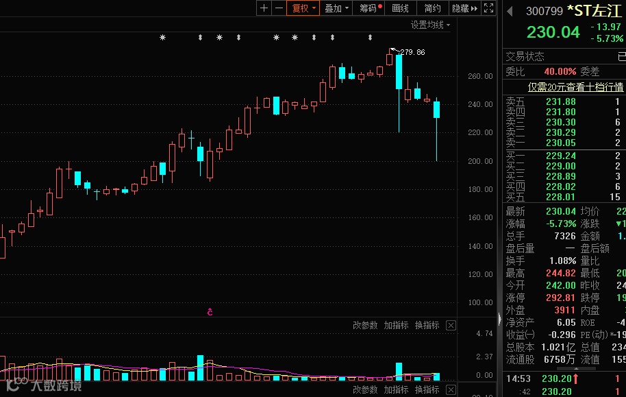 6月7日上午盘中,*ST左江股价再度闪崩,一度跌超18%,随后被快速拉起,跌幅收窄。截至收盘,该股跌5.73%,股价报收230.04元/股。