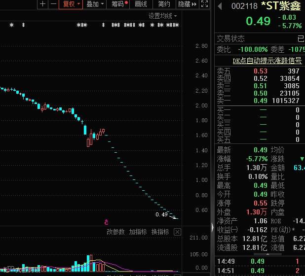 以*ST紫鑫为例,该股已连续14个交易日收盘价低于1元,最新股价创历史新低。即使该股后续6个交易日连续涨停,也无法达到1元之上,退市已经板上钉钉。*ST紫鑫是被誉为“东北人参之王”的中药材企业,股价巅峰时曾超过16元,如今被披星戴帽,最新市值只剩6.28亿元。