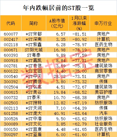 数据宝统计,今年以来ST股平均跌幅22%,大幅跑输同期上证指数。32只ST股今年以来跌幅超50%。跌幅最高的是*ST宋都,年内累计下跌81.51%。该股已连续16个交易日收盘价低于1元,触及交易类退市指标。