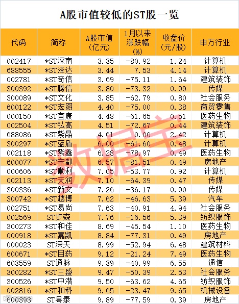 当前ST股存在市值低和股价低的特征。数据宝统计,截至6月7日收盘,120只ST股最新收盘价低于5元,占总数的75%以上。98只ST股A股市值低于20亿元,占总数的六成以上。市值最低的是*ST深南,最新A股市值为3.35亿元。