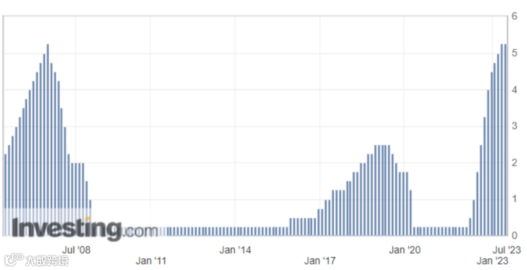 回顾美联储这一轮加息周期,不可谓不激进。自2022年3月开启加息以来,为了对抗通胀危机,美联储已连续10次加息,合计加息幅度高达500个基点,将利率推高至2001年3月以来的最高水平。