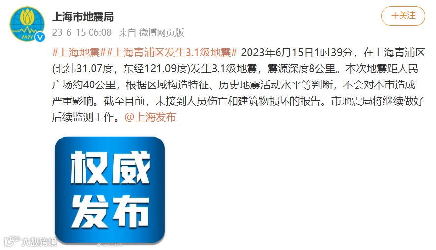 另外,今日凌晨,关于上海地震的消息突然刷屏。据中国地震台网中心官方微博消息,中国地震台网正式测定:6月15日01时39分在上海青浦区(北纬31.07度,东经121.09度)发生3.1级地震,震源深度8千米。据上海市消防救援总队青浦支队,目前暂未接到人员伤亡和房屋倒塌相关警情。