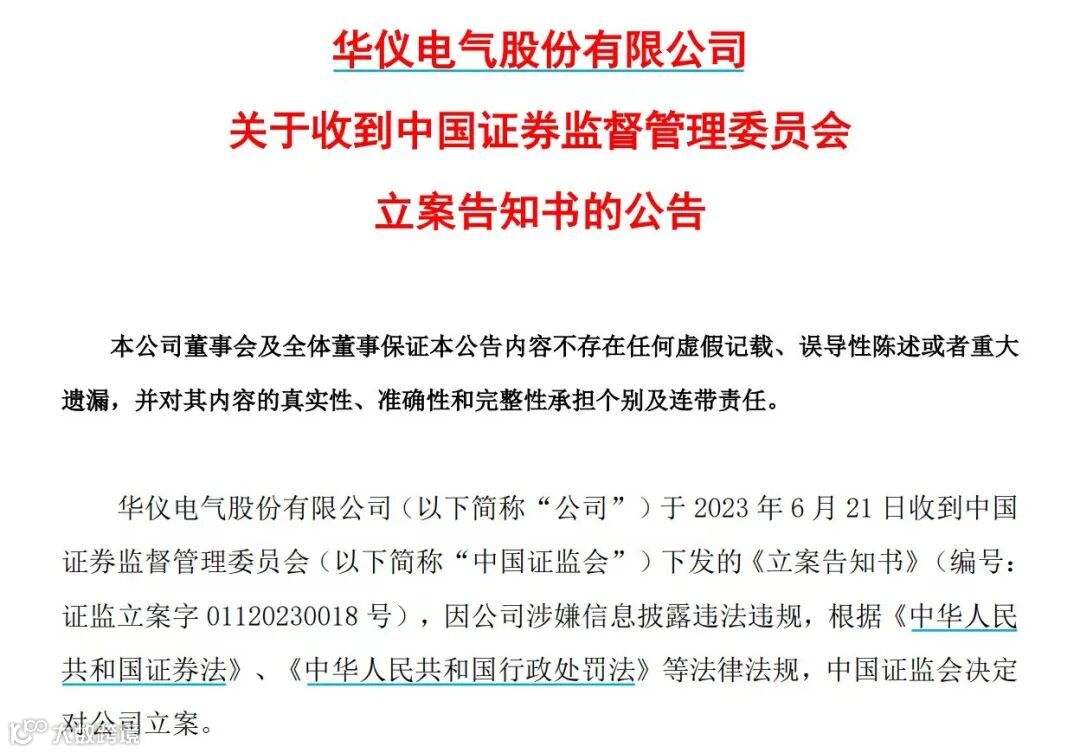 6月22日,*ST华仪发布关于收到中国证监会立案告知书的公告。公告显示,因公司涉嫌信息披露违法违规,中国证监会决定对公司立案。