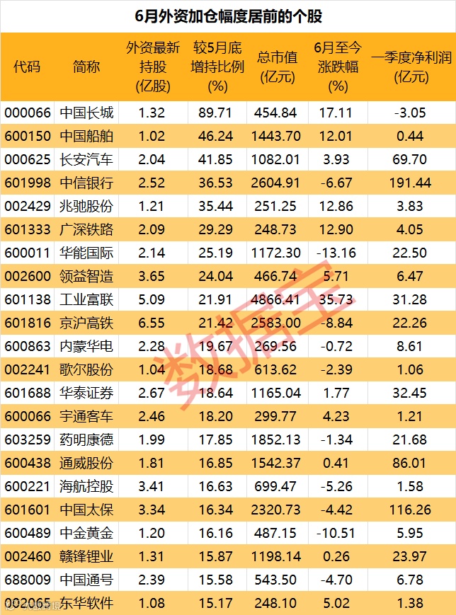 数据宝统计了外资最新持仓在一亿股以上,且较5月底持仓增加15%以上的个股,共计22只。以绝对量来看,京沪高铁以6.55亿股的持股量居首。近期,该股因客流量复苏强于预期为摩根大通上调目标价,维持“增持”评级。工业富联紧随其后,持股量5.09亿股;另有领益智造、海航控股、中国太保最新持股量逾3亿股。