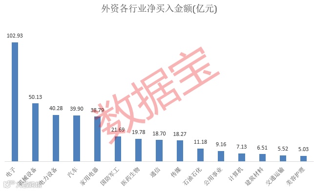 以申万行业划分,电子板块独占鳌头,外资净买入额高达102.93亿元;机械设备排名第二,净买入额50.13亿元;电力设备、汽车、家用电器等板块净买入在35亿元以上。净卖出方面,非银金融和食品饮料居前,额度均在60亿元以上。