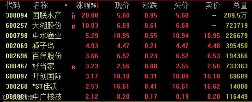 水产类股今日再度活跃,截至收盘,国联水产“20cm”涨停,大湖股份涨停斩获两连板,中水渔业、獐子岛涨约5%,好当家、百洋股份、开创国际等涨超3%。