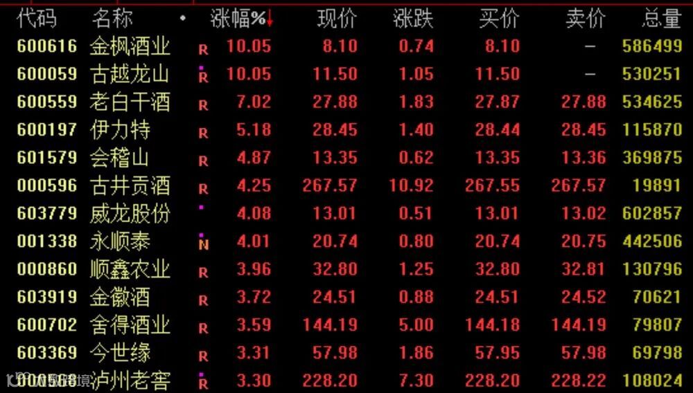 酒类股今日强势拉升,三大黄酒龙头集体走高,截至收盘,古越龙山、金枫酒业涨停,会稽山涨近5%。白酒股方面,老白干酒涨超7%,古井贡酒涨逾4%,舍得酒业、今世缘、泸州老窖等涨超3%。