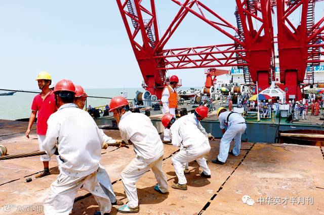 方案论证可行后,目光随之聚焦到前沿阵地。可是,问题却接踵而来,外海作业的442条嵌岩桩时刻面临塌孔、卷边变形,第一个预制墩台安装就花费了2个多月;起吊成功,拆装卡住,最终不惜忍痛剪断了价值20多万元一根的吊绳……项目主桥工区负责人陈永青说:“大家都是第一次,只能碰到问题,解决问题。442根钢管桩接近10%发生变形。但我们还是圆满地完成了全部钢管复合桩,而且I类桩的比例超过85%。我们还需要将相当于35层楼高、总起重量超过3000吨的异形重型钢索塔一次性吊装到位,并且是用两艘参数完全不同的起重船实现同步作业,共完成16次这样的吊装,确实是有难度。”陈永青说着指了指对面坐着的杨磊:“他是我们测控室主管,负责室外测量,当时都被晒成了‘阴阳脸’了。”30岁的杨磊接过话头儿说:“我是做测量嘛,视线不能动,结果几个小时暴晒下来,脸就一边黑一边白了,当晚就开始脱皮了。不过,这不算什么,听说还有冬天被海风吹得脸都僵化一半,不能动的同事。”