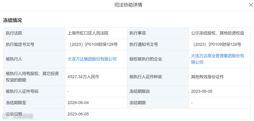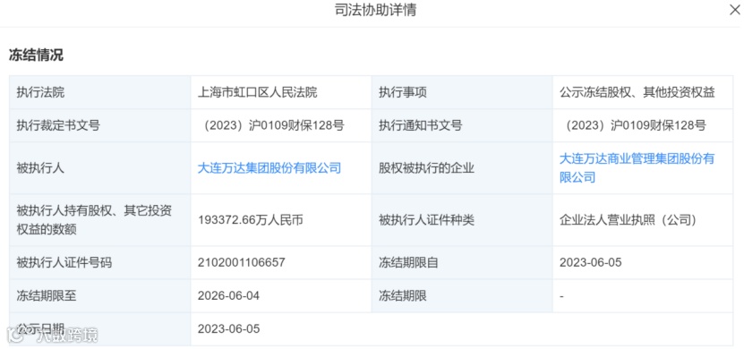 天眼查App显示,近日,大连万达集团股份有限公司新增2则股权冻结信息,股权被执行的企业均为大连万达商业管理集团股份有限公司,被冻结股权数额合计约19.8亿元,冻结期限自2023年6月5日至2026年6月4日。
