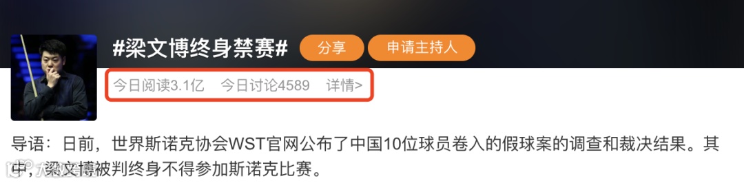 10名中国斯诺克球手遭遇严厉处罚,相关话题一度冲上微博热搜第一,截至发稿,“梁文博终身禁赛”话题阅读量超3.1亿。